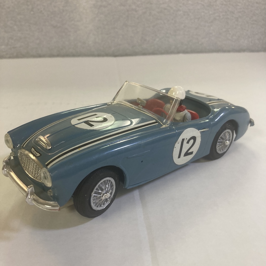 A 1/24th scale Tamyia set. A MIB later Strombecker 1/32nd scale Jaguar XKE with the brass chassis, 6 red colored Marx pit crew, 1/24th scale Tamyia set with 2 Lola T70s. 1/24th scale Strombecker Grand Prix Racing set, Antique rare 1905 Travers Les Alpes Penny Tin Toy Car Race Track Set , Speedking rare Volvo Amazon, VIP Honda F1, 2 rare Joma Simca Versailles,